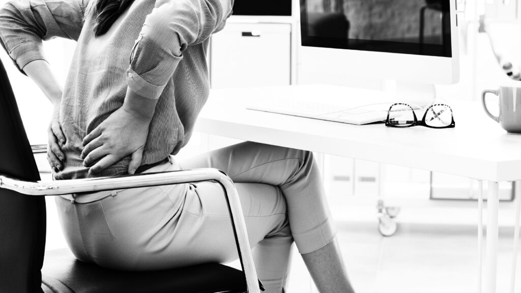 • Take time to adjust your chair, so your feet are flat on the ground and your knees bent, with a slope from your hips to your knees. You should end up with your hips higher than your knees and your eyes level with the top of the computer screen.